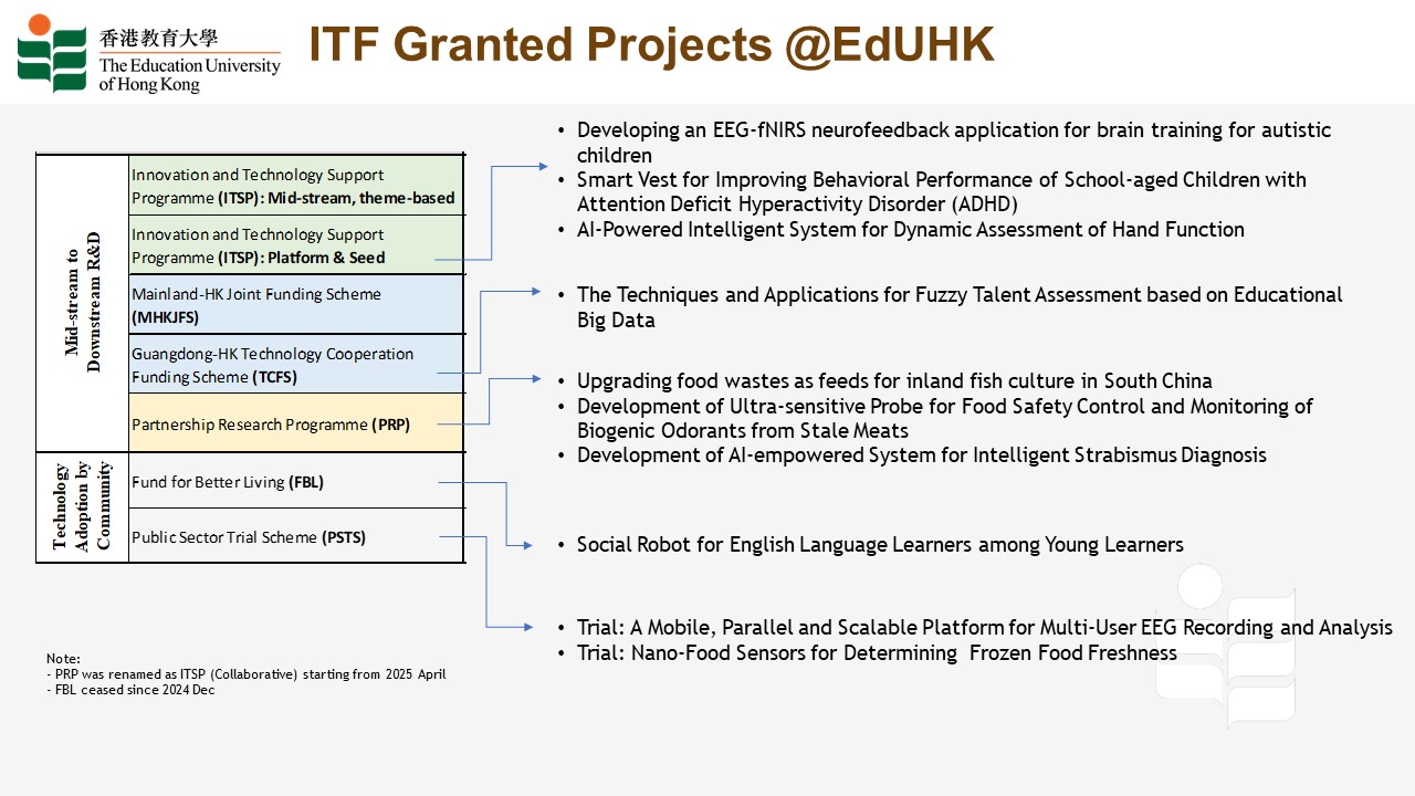 「創新及科技基金」由創新科技署管理,希望提升本地大學、科研中心和企業的應用科技實力,鼓勵和協助院校與經濟體之間的合作和連結。創新科技基金包括不同計劃,詳情可瀏覽: