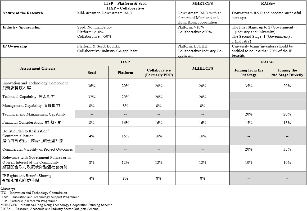 知識轉移辦公室提供以下創新及科技基金不同計劃的評估準則表 (只提供英文版):