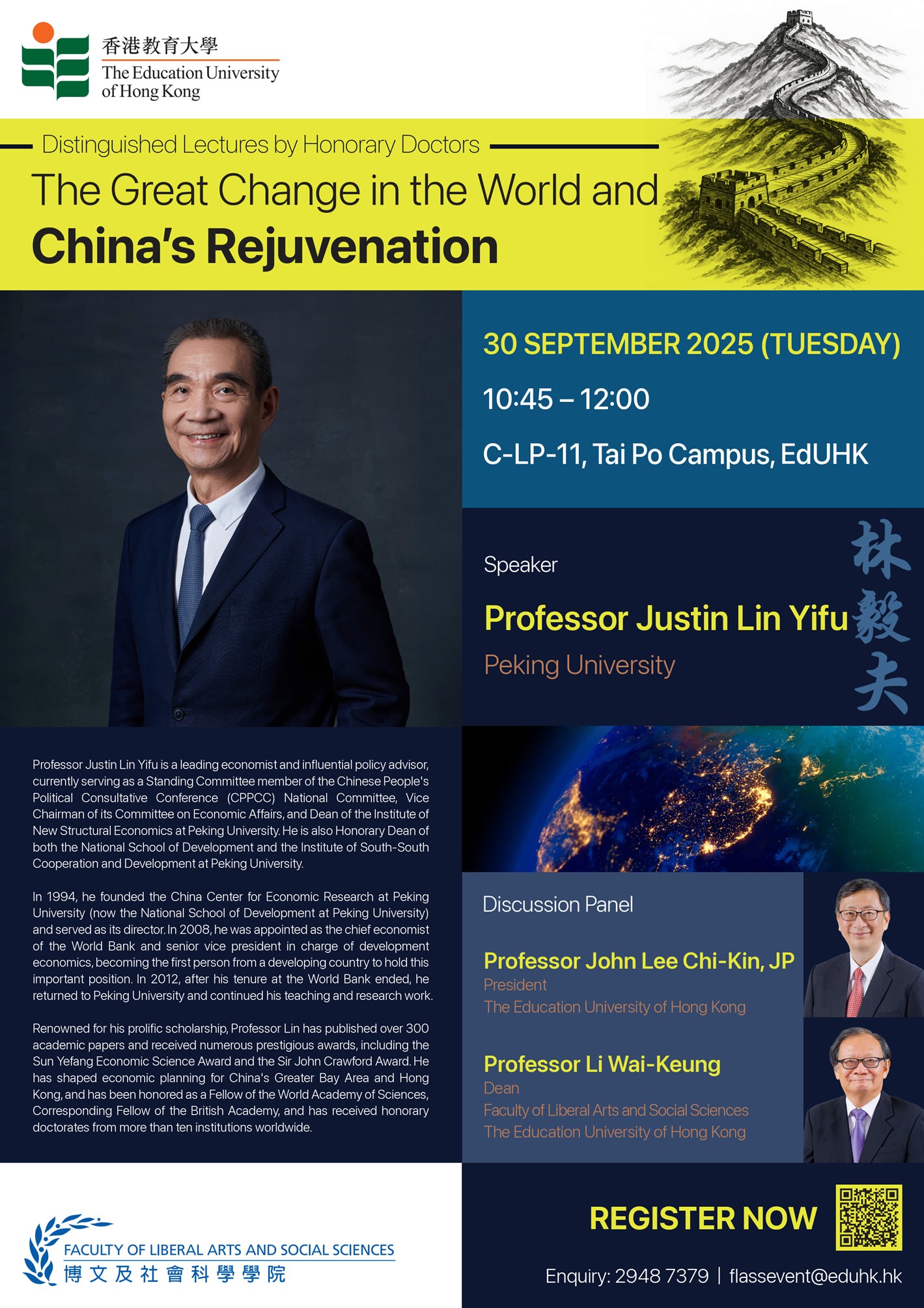 Renowned for his prolific scholarship, Professor Lin has published over 300 academic papers and received numerous prestigious awards, including the Sun Yefang Economic Science Award and the Sir John Crawford Award. He has shaped economic planning for China's Greater Bay Area and Hong Kong, and has been honoured as a Fellow of the World Academy of Sciences, Corresponding Fellow of the British Academy, and has received honorary doctorates from more than ten institutions worldwide.