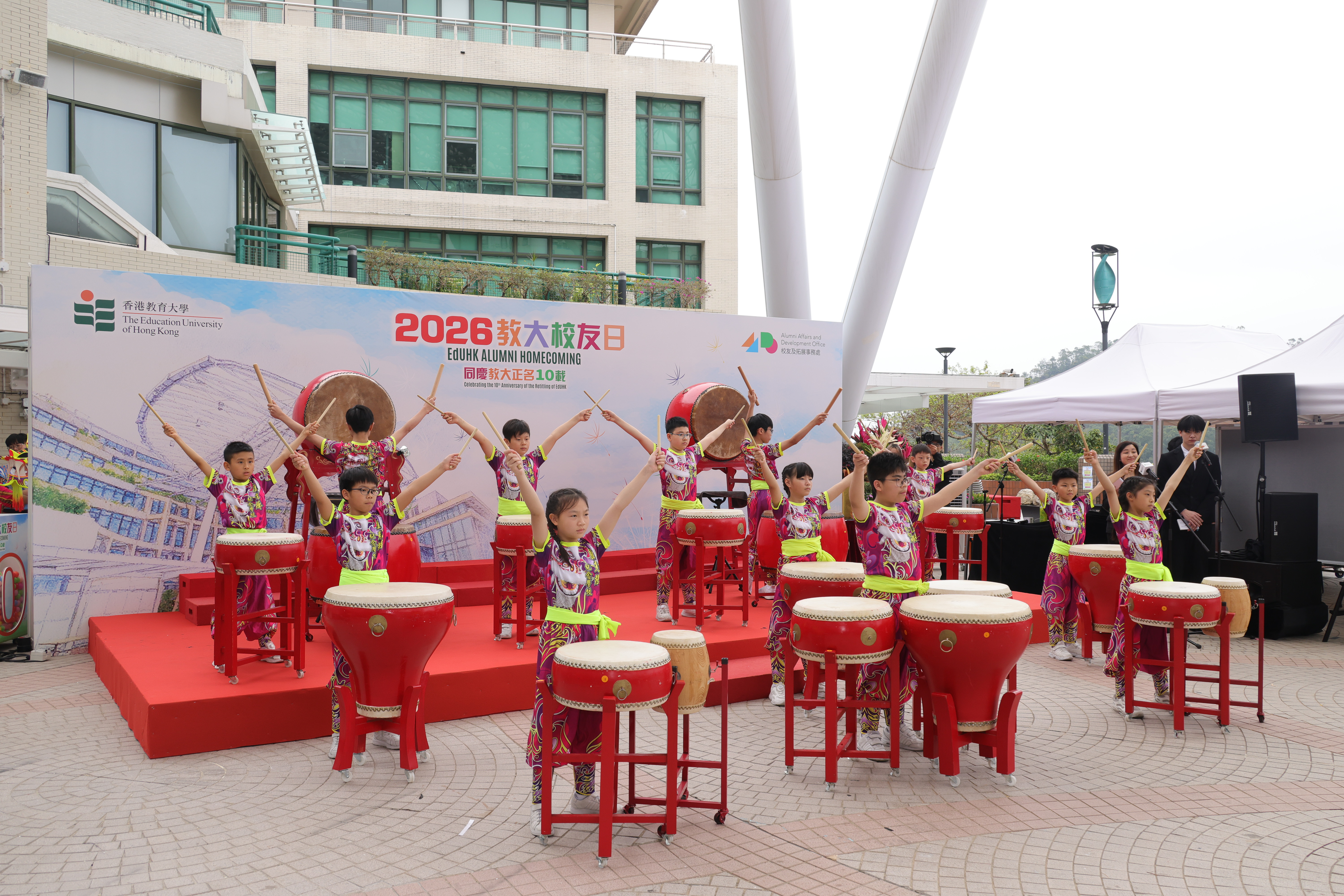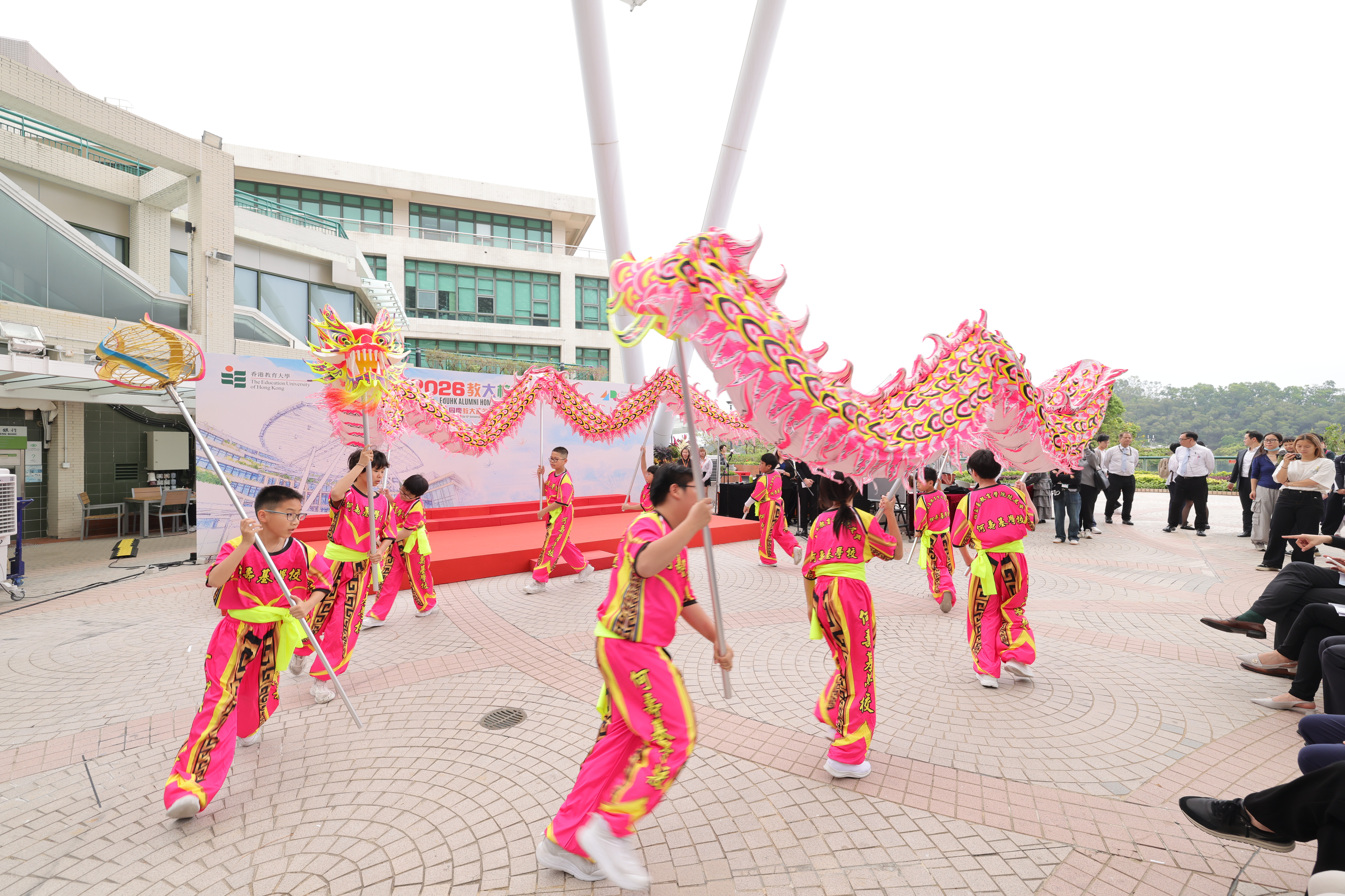 The opening ceremony was co‑hosted by alumna and artist Ms Angie Mak and an EdUHK student. Performances included a drum presentation by the Percussion Band of S.R.B.C.E.P.S.A. Lu Kwong Fai Memorial School, followed by a dragon dance by students from S.R.B.C.E.P.S.A. Ho Sau Ki School, adding festive flair to the event.