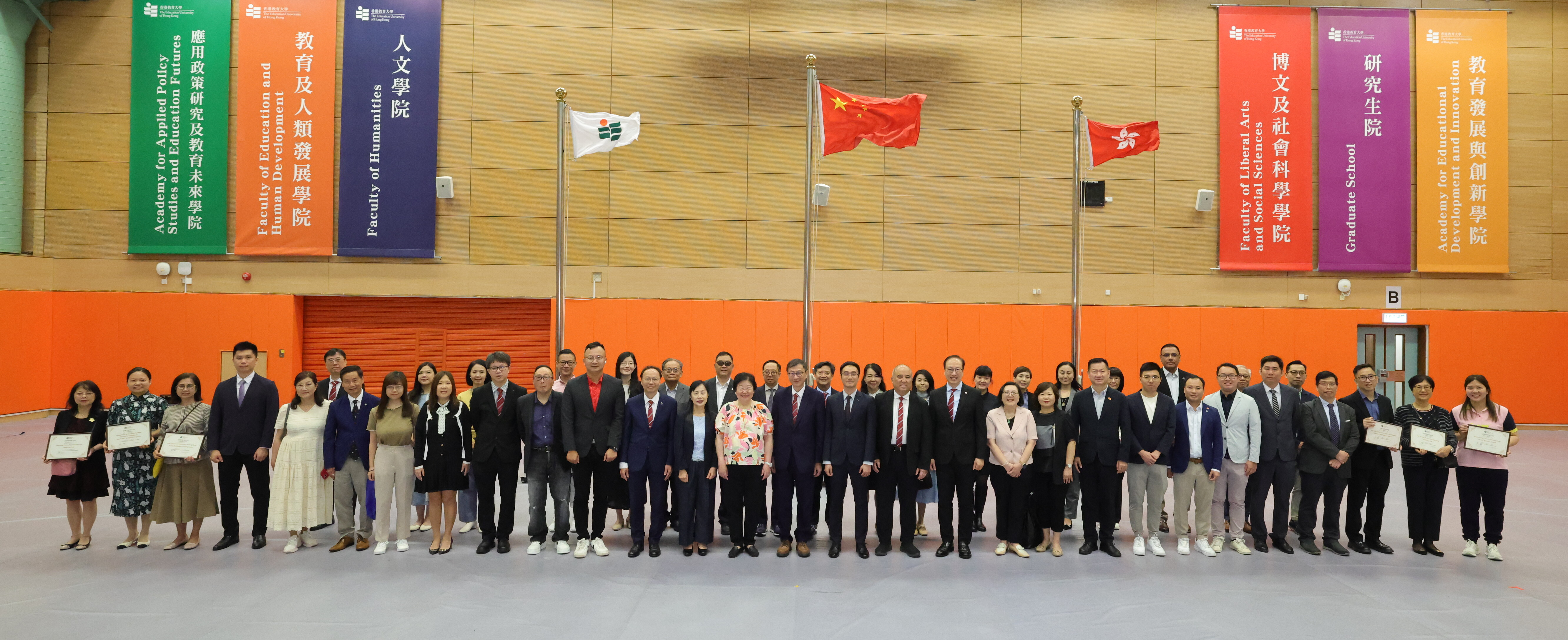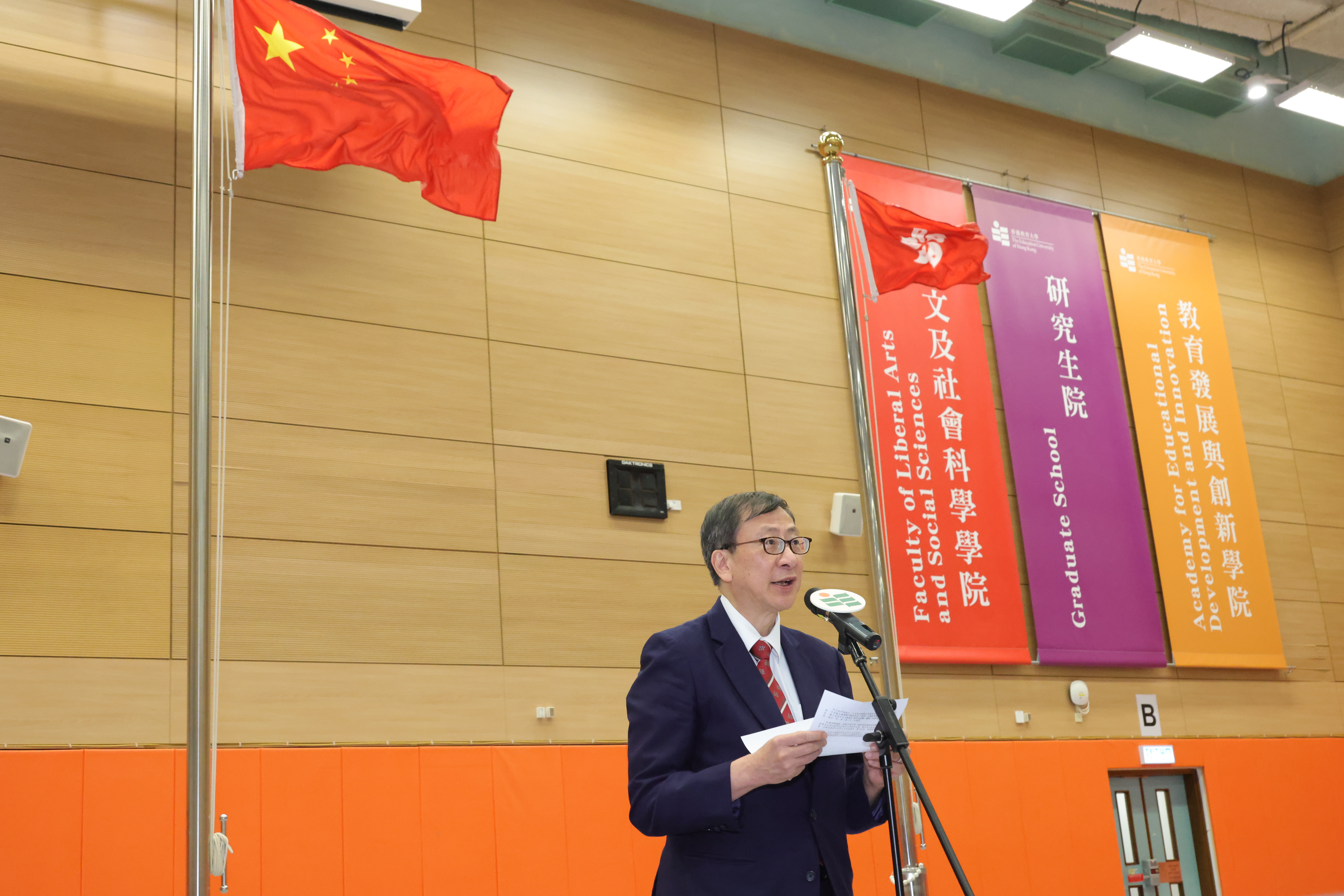 The ceremony commenced with the EdUHK student flag-raising team marching in with the national flag, regional flag, and university flag. Attendees stood in solemn observance as the flags were raised to the national anthem.