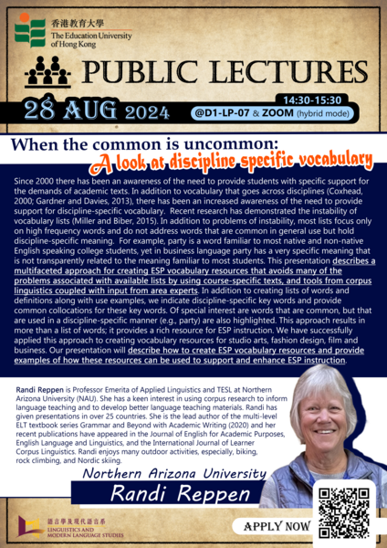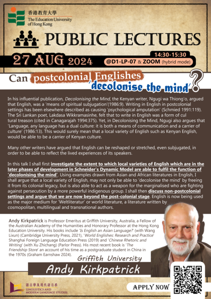 The Adjunct Professors' Public Lectures took place on September 27 and 28, 2024, in hybrid mode. Topics included "Can postcolonial Englishes ‘decolonise the mind’?" by Prof. Andy Kirkpatrick and "When the common is uncommon: A look at discipline-specific vocabulary" by Prof. Randi Reppen. These lectures were accessible to the public via registration for Zoom links or in-person attendance.