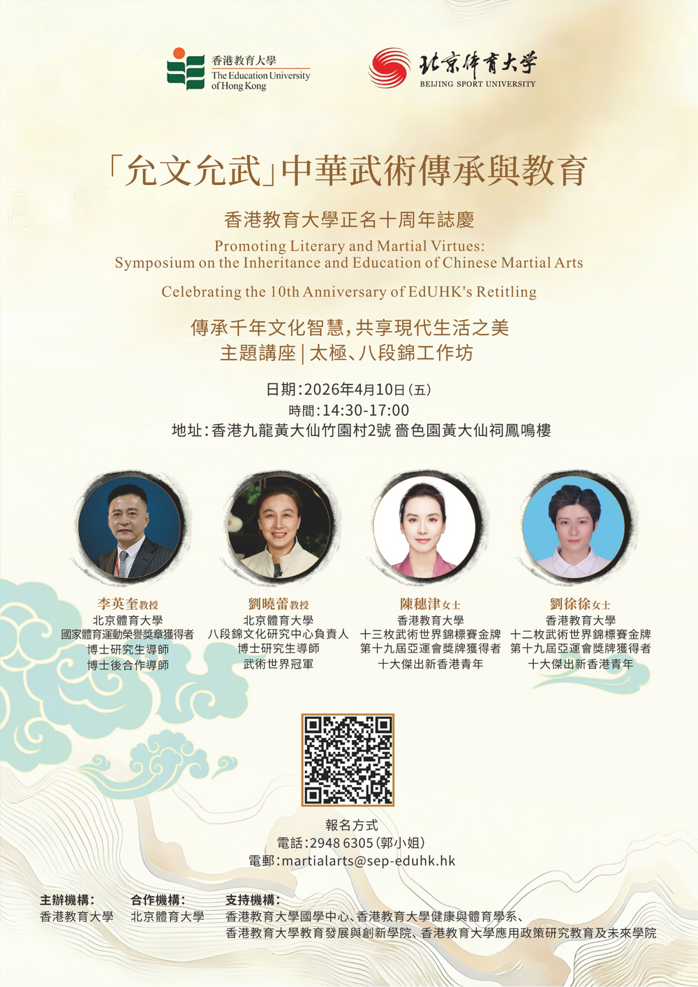 为深入推动中华优秀传统文化的教育与传承,并庆祝香港教育大学(教大)正名十周年,教大联同北京体育大学将于二零二六年四 月十日(星期五)举办「允文允武」中华武术传承与教育研讨会,构建一个前沿的交流平台,促进理论与实践的结合,探索如何通过武术教育赋能全人发展,为弘扬中华文化、培育新时代人才。本次研讨会旨在以中华武术为聚焦点,探讨其作为融合哲学、伦理、历史与体育的活态文化载体,在当代教育体系中的多元价值与实施路径;同时推动香港教育局爱国主义教育与国民身份认的相关政策,进一步加强学生对中华文化的理解与文化自信,并积极配合国家「十五五」规划对健康中国与文化自信的战略号召,厚植大众的国家情怀。
