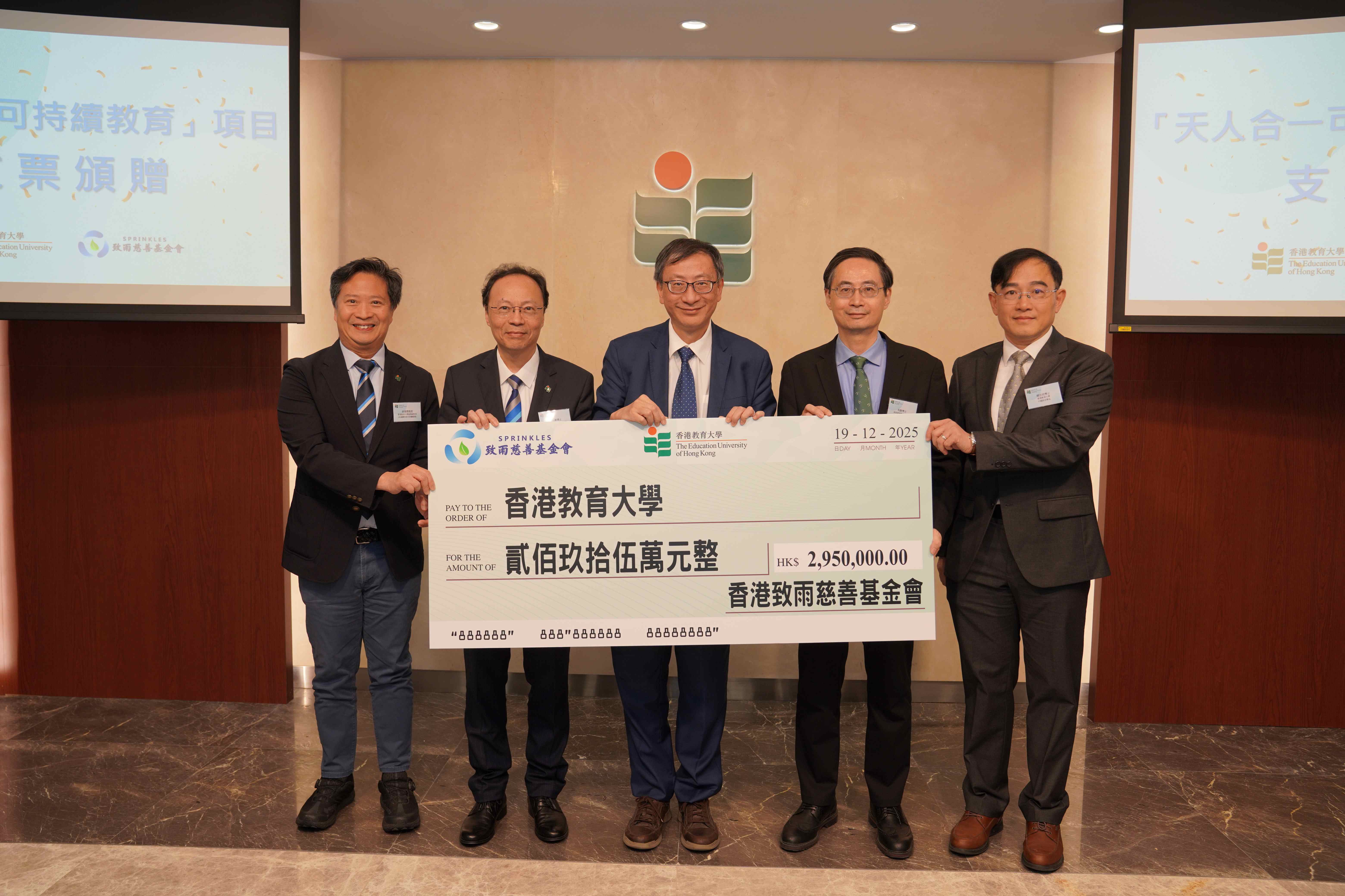 支票捐赠仪式于2025年12月19日在教大大埔校园举行,由致雨慈善基金会主席马骏博士主持捐赠,教大校长李子建教授、协理副校长(知识转移与可持续发展)翁建霖教授,以及中国语言学系高级讲师赖志成博士代表校方接受。