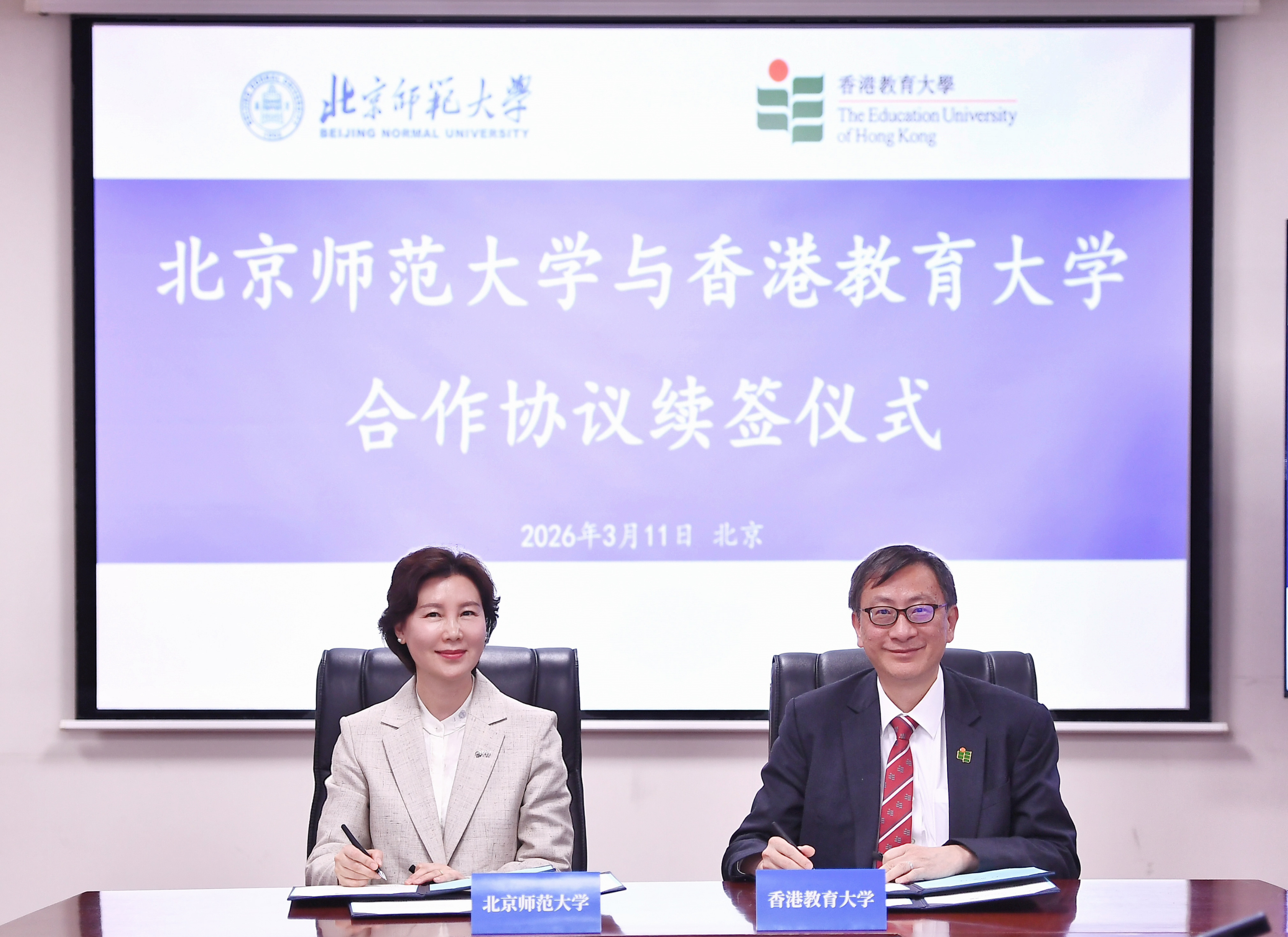 3月11日下午,代表团首先拜访北京师范大学,与校长于吉红教授及副校长陈兴教授为首的北师大团队进行友好会谈。作为同样以师范教育为核心特色的顶尖学府,教大与北京师范大学在教师教育、科研合作、人才培养与师生互访等方面长期保持广泛而深入的合作。此次会面中,于吉红校长表示愿充分发挥北师大「一体两翼」的办学优势,与香港教大积极探索合作新模式,助力粤港澳大湾区教育高品质发展;而李子建校长则期待两校充分发挥各自学科特色与优势,在国家安全、中华文化、人工智慧及新媒体等领域,通过多元合作模式展开更紧密的互动。双方除续签既有合作协议外,就未来合作方向与合作新机进行深入交流与探讨。