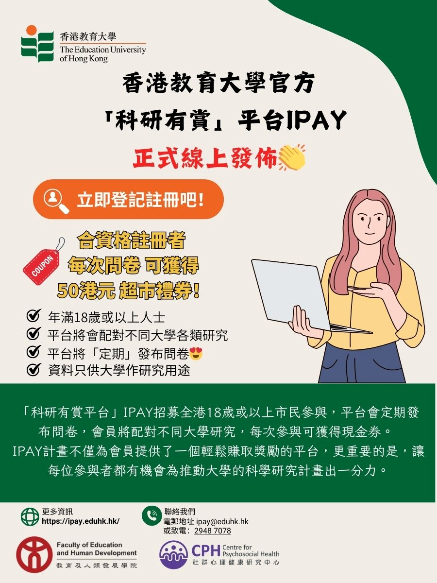 我們的團隊目前正從事多個項目,包括預測香港的就業需求以支持青年職業發展和勞動力規劃、創建反映香港人口主要特徵的組成人口、以及開發互聯網科研參與平台iPAY (https://ipay.eduhk.hk/) 以促進有效的線上調查。這項計劃標誌著香港教育大學首次為社會科學研究建立大數據基礎設施的大規模努力,為高質量、有影響力的項目提供長期平台。憑藉以人口為基礎的18歲或以上參與者群組,當中包括穩定及具代表性的16至34歲青少年子樣本,iPAY可透過贊助顧問服務及研究合作,為其他機構及組織的研究項目提供寶貴的資源。目前,香港並沒有支援社會科學研究的現有大數據基礎設施。透過我們的策略性研究合作,這套基礎設施將成為社會科學研究群組的重要資產,吸引香港教育大學內部以及與其他大學和組織設計高質的研究合作,有助於發展具影響力和可持續的政策研究和實施。