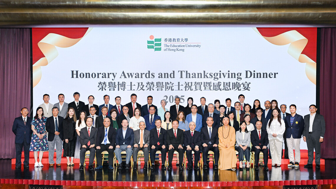 香港教育大學(教大)於二零二五年九月二十六日舉行「榮譽博士及榮譽院士祝賀暨感恩晚宴」,感謝捐贈者、校友及合作夥伴的長期支持,並表揚獲獎學金學生的卓越表現。校董會主席黃友嘉博士及校長李子建教授主持晚宴,祝賀獲頒榮譽博士及榮譽院士的傑出人士: